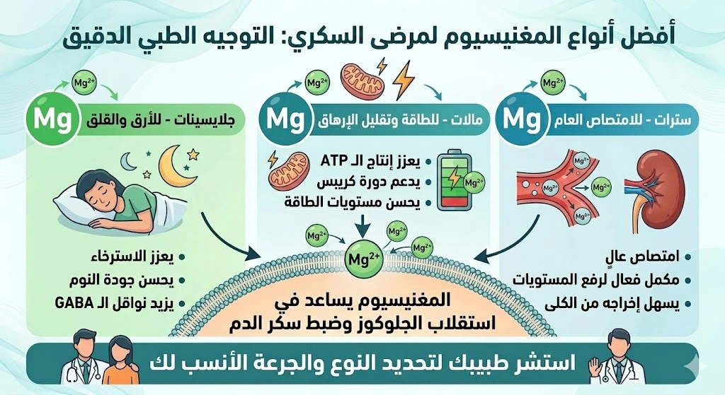 تشير الأبحاث إلى أن “جليسينات المغنيسيوم” (Magnesium Glycinate) تعتبر خياراً ممتازاً لمرضى السكري. لماذا؟ لأنها مرتبطة بحمض أميني هو “الجليسين”، مما يجعل امتصاصها في الأمعاء سهلاً جداً، ولا تسبب عادةً تأثيراً مليناً للمعدة كما تفعل الأنواع الأخرى (مصدر).